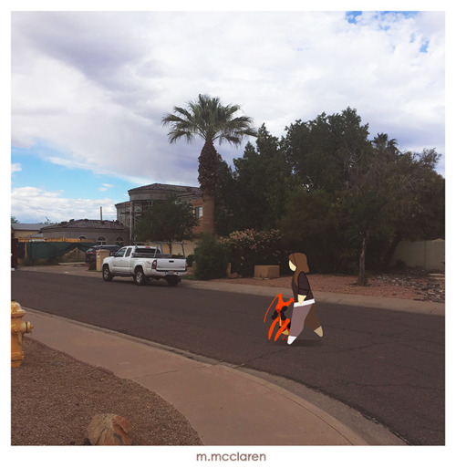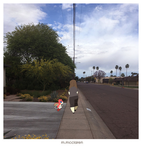 [Description: A photo of a neighborhood street. A cartoon of myself walks alongside a Kricketune from Pokemon.]