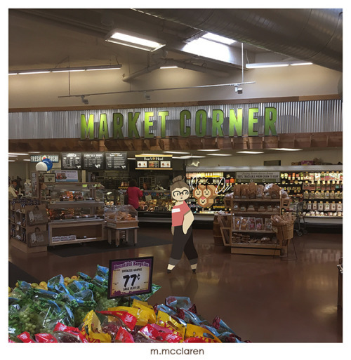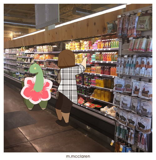 [Description: A photo inside Sprouts grocery store. A cartoon of myself walks alongside a Combee from Pokemon.]