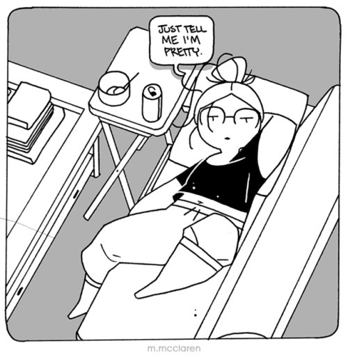 [Description: An illustration of myself lounging on the couch in less than elegant dress. There are crumbs on my shirt. I look bored. A text bubble reads ‘Just tell me I’m pretty.’]