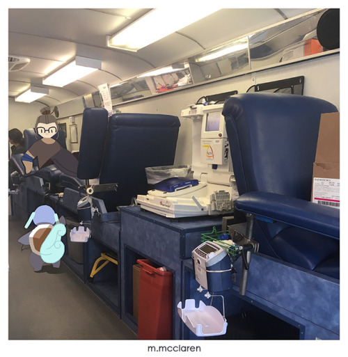 [Description: A photo of the interior of a blood donation van. A cartoon of myself sits in one of the seats, having given blood. Beside me is a Wartortle from Pokemon.]