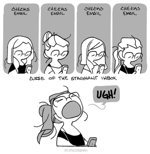 [Description: A five panel comic. The first four panels show me repeatedly checking my email. The final panel shows me screaming. Text above reads ‘Curse of the stagnant inbox.’]