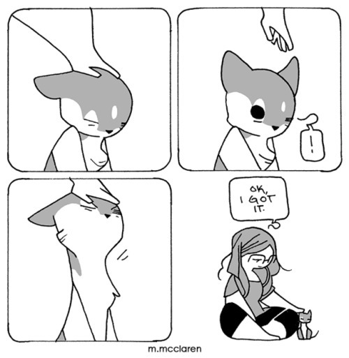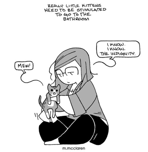 [Description: An illustration of myself, holding up a kitten and wiping it’s bottom with tissue. Text above reads: ‘Really little kittens need to be stimulated to go to the bathroom.’ The kitten responds with a ‘Mew!’ and I reply back ‘I know. I know. The indignity.’]