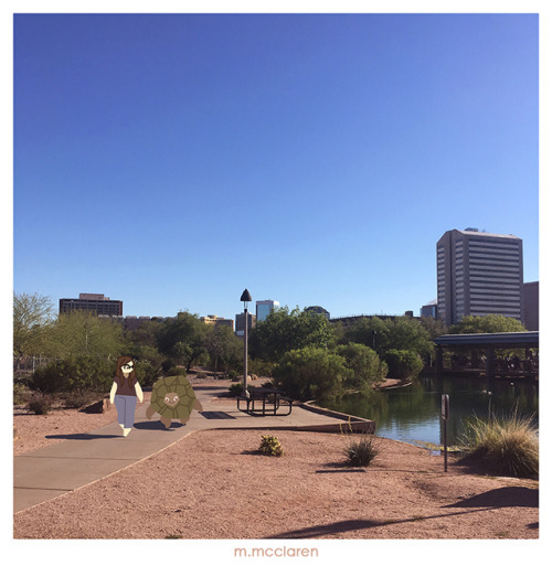 [Description: A photo of a park walkway. A cartoon of myself walks alongside a Golem from Pokemon.]