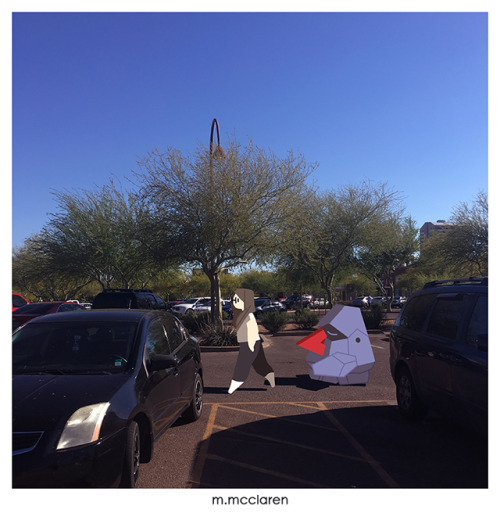 [Description: A photo of a parking lot. A cartoon of myself walks between cars, followed by a Nosepass from Pokemon.]