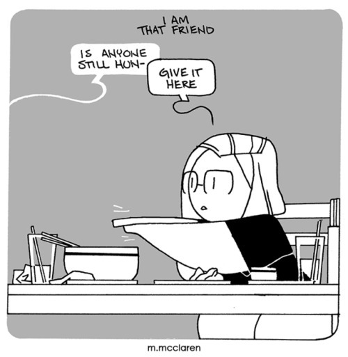 [Description: A comic depicting me sitting at a restaurant table. Text reads: ‘I am THAT friend.’ A speech bubble off panel says: ‘Is anyone still hun-’ and I interrupt stating ‘Give it here.’ I am making grabby hands in the direction of the unfinished food.]
