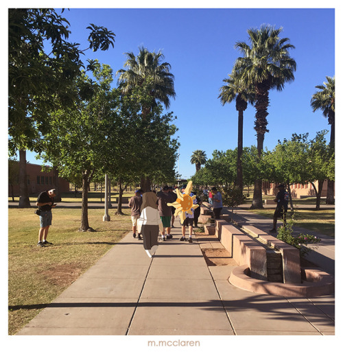 [Description: A photo of the park near sunset. A cartoon of myself walks with the crowd, beside a Solrock from Pokemon.]