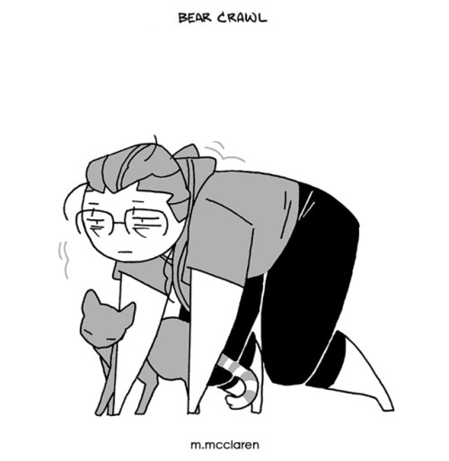 [Description: A cartoon of myself doing an exercise called a Bear Crawl. It’s when you’re on all fours and then pull your knees about an inch off the ground and hold. Walking in between my limbs is my cat Little Lady. She looks pleased. I do not.]