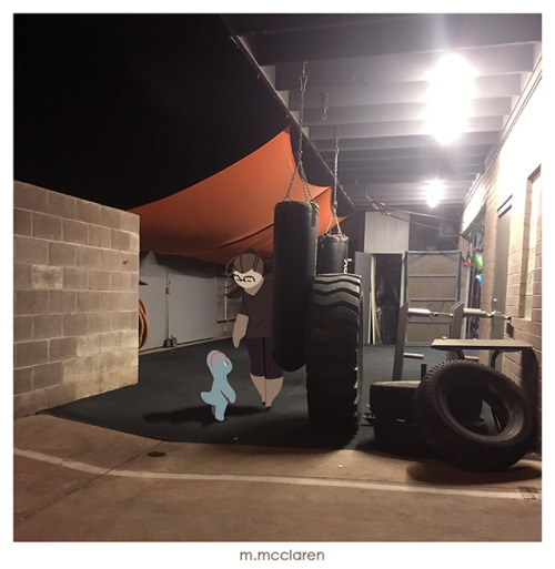 [Description: A photo of a outside work area of a gym. A cartoon of myself stands next to a punching bag, looking down at a Machop from Pokemon.]
