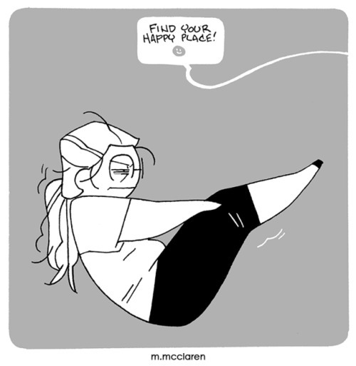 [Description: A black and white illustration of myself doing a V sit exercise. I look haggard. A speech bubble above me tells me to ‘Find my happy place. :)’]