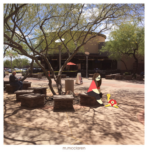 [Description: A photo of a shopping center’s outdoor seating. A cartoon of myself sits on a bench, looking down at a Shuckle from Pokemon.]