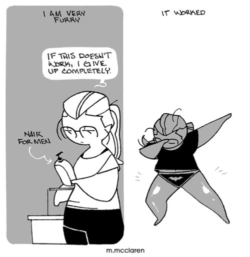 [Description: A two panel comic. The first panel shows me carrying a grocery store basket and a lotion bottle with an arrow pointing at it saying ‘Nair for Men.’ Text above reads ‘I am very furry.’ And my speech bubble states: ‘If this doesn’t work, I give up completely.’