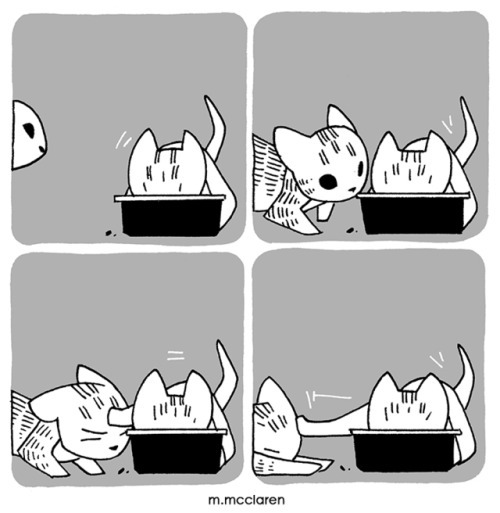 [Description: A four panel comic depicting one kitten eating and another investigating the food. As the curious kitten gets closer, he is stopped and pushed away by the eating kitten.]