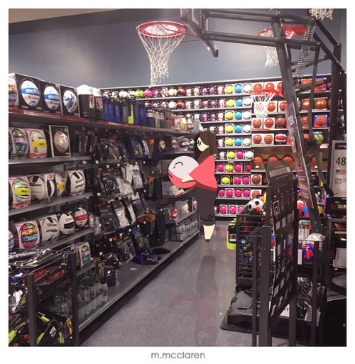 [Description: A photo from inside a sporting goods store, the volleyball aisle. A cartoon of myself stands looking at the balls while holding an Electrode from Pokemon.]