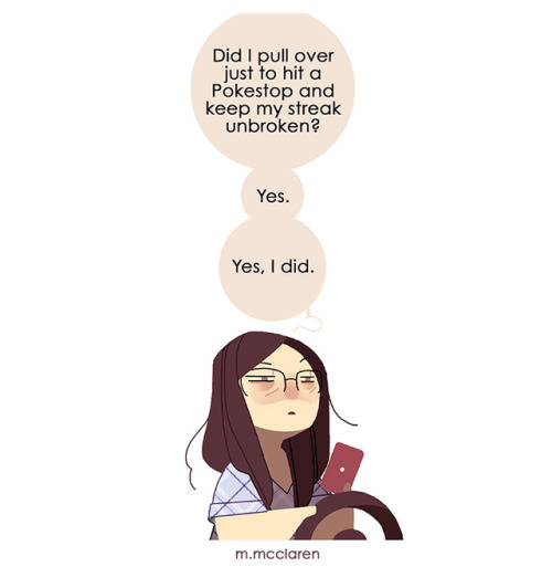 [Description: A cartoon of me sitting in front of a driving wheel and holding my phone. My speech bubble reads: ‘Did I pull over just to hit a Pokestop and keep my streak unbroken? Yes. Yes, I did.’]
