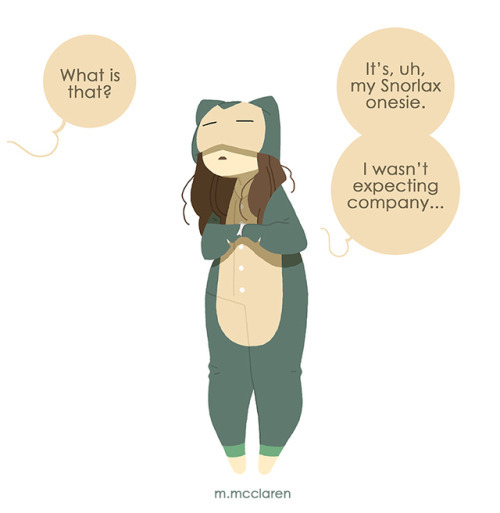 [Description: An illustration of myself sheepishly wearing a Snorlax onesie. Off screen, I am being asked ‘What is that?’ To which I respond ‘It’s, uh, my Snorlax onesie. I wasn’t expecting company…’]