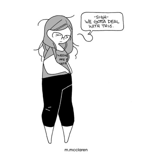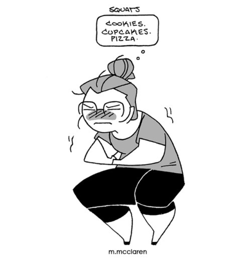 [Description: An illustration of myself doing squats. Internally, I’m thinking about cookies, cupcakes, and pizza to get through the exercise.]
