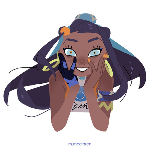 [Description: An illustration of Nessa from Pokemon Sword and Shield. She is holding her face with both hands and smiling.]