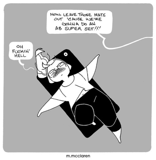 The second illustration shows me lying on an exercise mat, looking fatigued. Off panel we are being told that we’re about to do an ab super set. My response is to say ‘oh fuckin’ hell.’