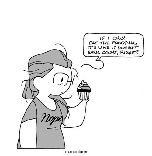 The third illustration shows me holding up a cupcake. The speech bubble reads: ‘If I only eat the frosting, it’s like it doesn’t even count, right?.’]