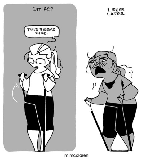 [Description: A two panel comic illustrating myself using an exercise band to work out. The first panel reads: 1st Rep and I am saying ‘This seems fine.’ The second panel depicts me clearly struggling 2 reps later.]