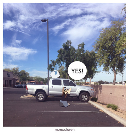 [Description: A photo of a parking lot. Sitting on top of a truck is an illustration of an Altaria from Pokemon. In front of the truck, a cartoon of myself is kneeling with my hands in the air in excitement yelling ‘YES!’]