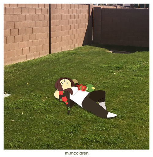 [Description: A photo of a backyard lawn. A cartoon of myself lies in the grass with a Bellossom from Pokemon.]