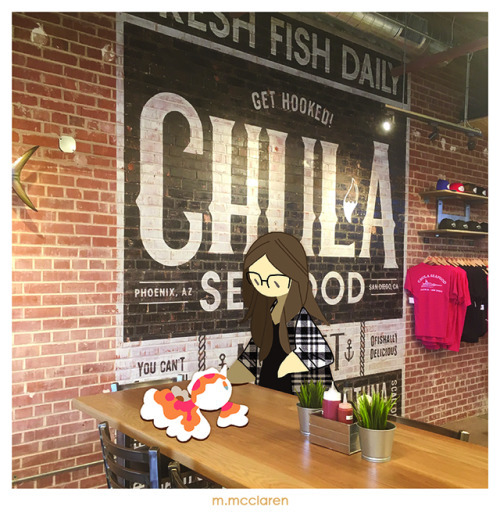 [Description: A photo from within Chula Seafood Market. A cartoon of myself stands beside a table, looking at a Goldeen from Pokemon sitting on the tabletop.]