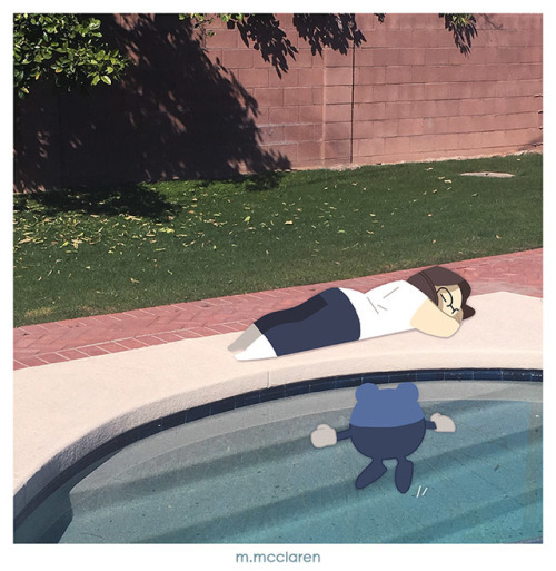 [Description: A photo of a backyard pool. A cartoon of myself sleeps on the concrete. In the pool, a Poliwhirl from Pokemon floats.]