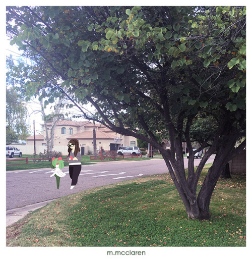 [Description: A photo of a neighborhood street. A cartoon of myself walks alongside a Kirlia from Pokemon.]