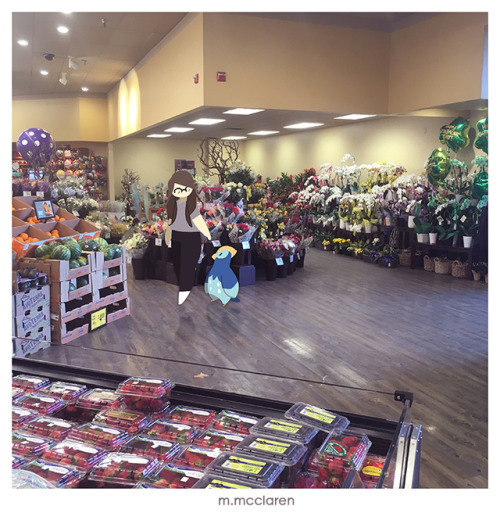 [Description: A photo of the produce and flower aisles of a grocery store. A cartoon of myself is walking beside a Prinlup from Pokemon.]