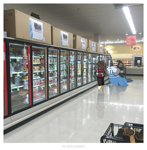 [Description: A photo of the frozen food aisle. A cartoon of myself stands beside a Walrein from Pokemon.]