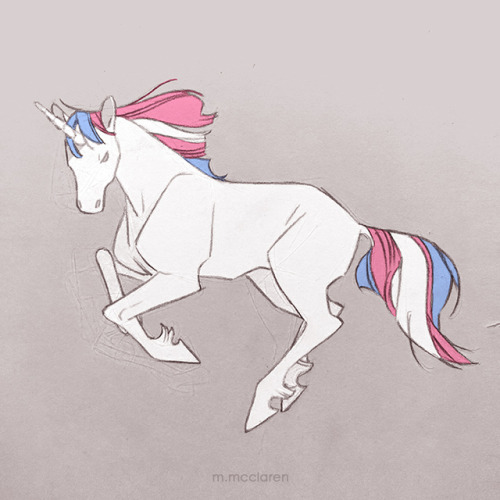 [Description: An illustration of a galloping unicorn. It’s mane and tail are colored in the trans pride colors.]