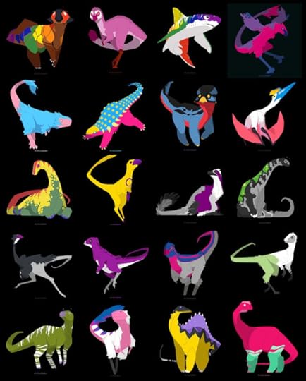 Line 1 from Left to Right: Pride-acosaurus, Lesbian-asaura, Me-gay-lodon, Bi-lociraptor