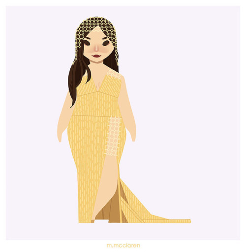 [Description: An illustration of Rosie Huntington Whitely as she appeared at the 2018 Met Gala, in a light gold dress.]