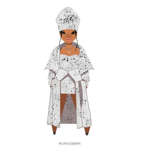 [Description: An illustration of Rihanna as she appeared at the 2018 Met Gala in all her silver papal glory.]