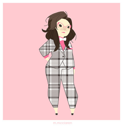 [Description: An illustration of me, wearing a tight grey plaid suit with a bright pink shirt and a white bow tie.]