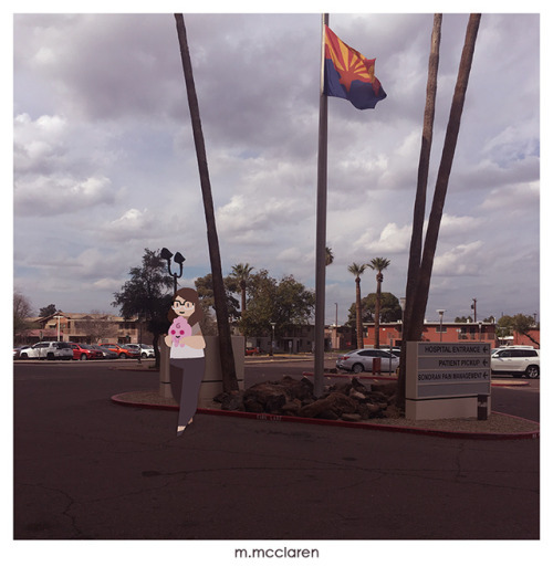[Description: A photo of a parking lot dropoff. A cartoon of myself walks while carrying an Igglybuff from Pokemon.]