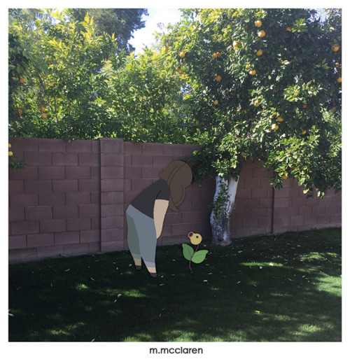 [Description: A photo of a backyard. A cartoon of myself leans down to get a better look at a Bellsprout from Pokemon.]