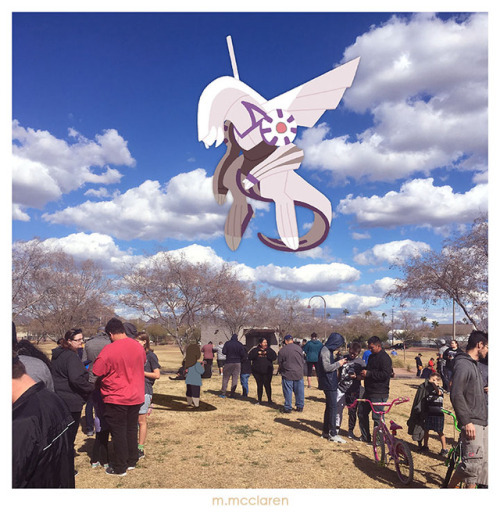 [Description: A photo of a crowded park. A cartoon of myself stands near the middle left, looking up at a Palkia from Pokemon in the sky.]