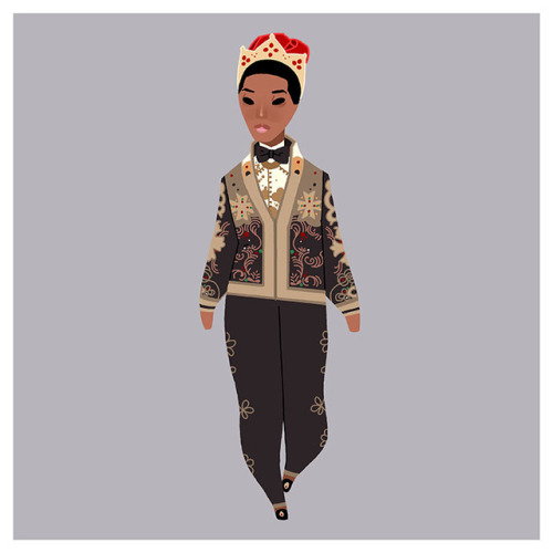[Description: An illustration of Christian Combs as he appeared at the 2018 Met Gala, wearing a black and gold suit and a red velvet crown.]