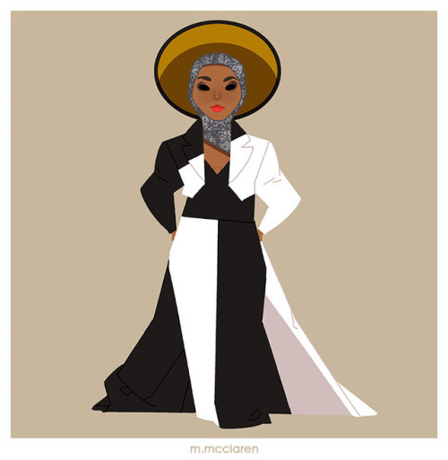[Description: An illustration of Janelle Monae as she appeared at the 2018 Met Gala, in a black and white dress.]
