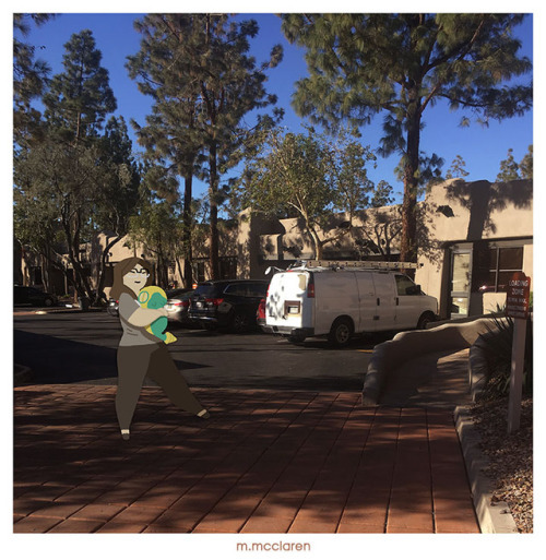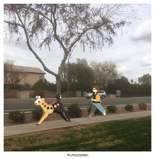 [Description: A photo of a sidewalk. A Girafarig from Pokemon is running around with a cartoon of myself behind them.]