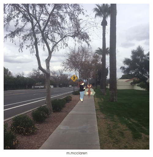 [Description: Photo of a sidewalk. A cartoon of myself walks alongside a Lopunny from Pokemon.]