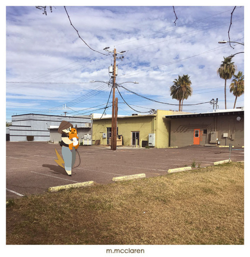 [Description: A photo of a parking lot behind a strip mall. A cartoon of myself holds a Raichu from Pokemon.]