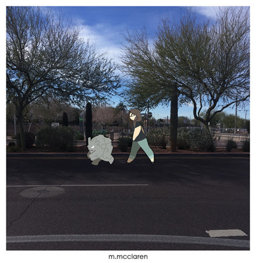 [Description: A photo of a street. A Graveler from Pokemon is walking down the street followed by a cartoon of myself.]