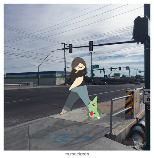 [Description: A street sidewalk. A cartoon of myself walks beside a Larvitar from Pokemon.]