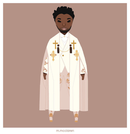 [Description: An illustration of Chadwick Boseman as he appeared at the 2018 Met Gala in a white suit and cape with gold trimmings.]