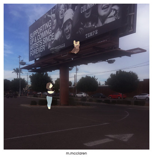 [Description: A photo of a parking lot billboard. Sitting on the billboard is a Noctowl from Pokemon. Below is a cartoon of myself.]