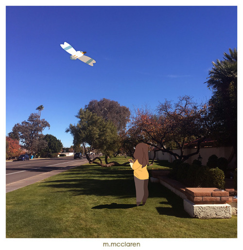[Description: A photo of a lawn. A cartoon of myself stands looking up at a flying Wingull from Pokemon.]