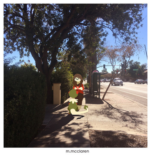 [Description: A photo of a street sidewalk. A cartoon of myself stands looking down at a Breloom from Pokemon.]